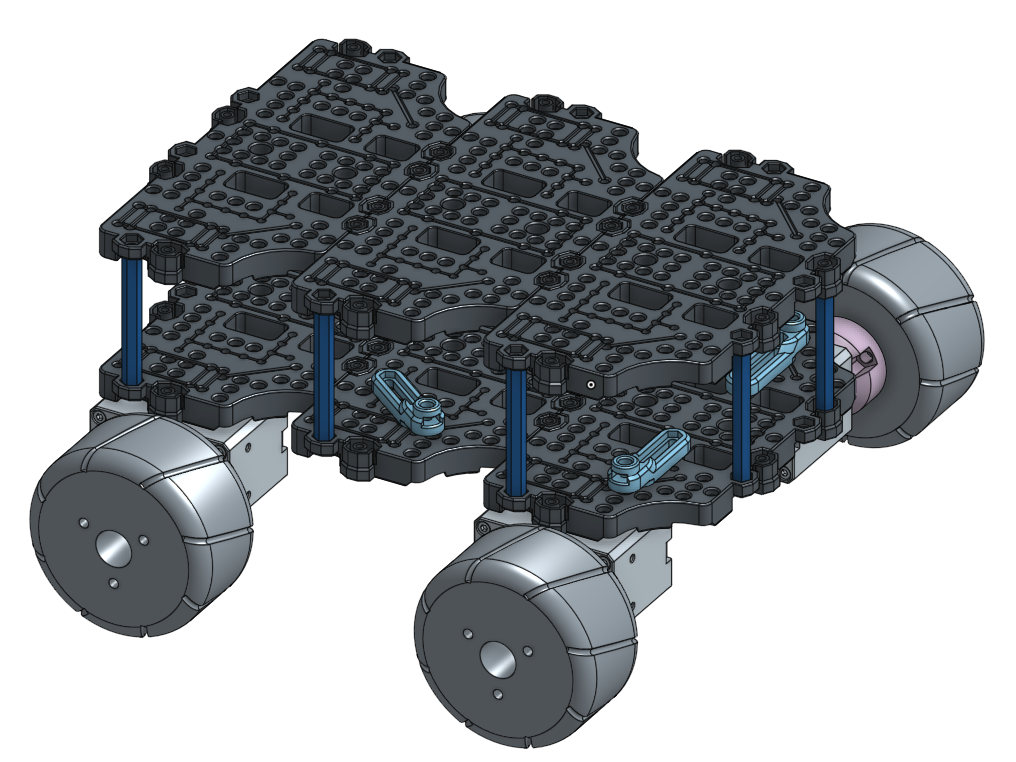 Конструкция мобильного робота выполнена по модульному принципу, позволяющему сочетать возможность сборки различных конструкций робота из элементов, входящих в состав набора и элементов, получаемых путем прототипирования. В состав комплекта входит набор базовых библиотек, включающих трехмерные модели основных узлов и деталей конструкций мобильного робота.
