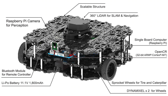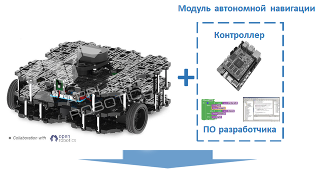 В состав комплекта входит мобильный робот TurtleBot3 Waffle Pi, программируемый одноплатный микрокомпьютер с интегрированным программным обеспечением для автономной навигации мобильных роботов и модуль стереозрения SVCam, представляющий собой модульное устройство на основе микрокомпьютера, периферийного контроллера и двух интегрированных модулей технического зрения.