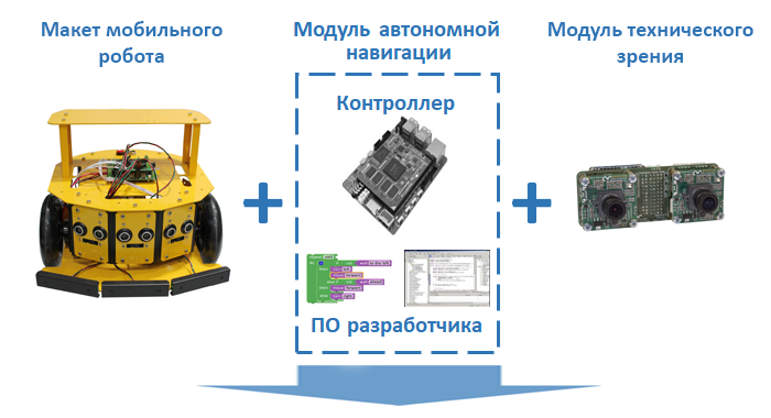 - Модуль стереозрения (две камеры, плата аппаратной синхронизации, встроенный микропроцессорный модуль для обработки данных и формирования карты глубины, поддержка ПО на базе ROS) – 1 шт.